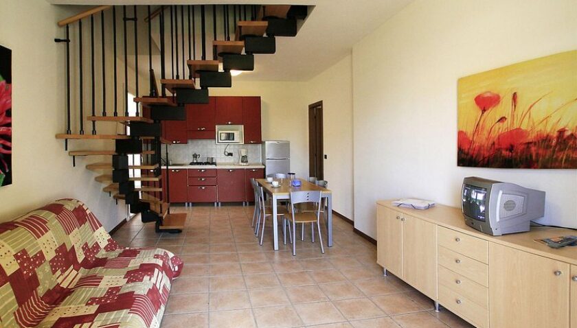 7 Personen/60 qm Typ 4: 3-Raum-App. über 2 Etagen. Wohn-/Schlafzimmer im EG (1 Doppelschlafcouch). 2 Schlafzimmer im OG (1B+1D), (2B). 2. Bad: Dusche, Bidet, WC. Terrasse, Balkon, Gartenmöbel. In einer Villa.