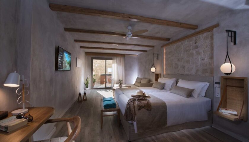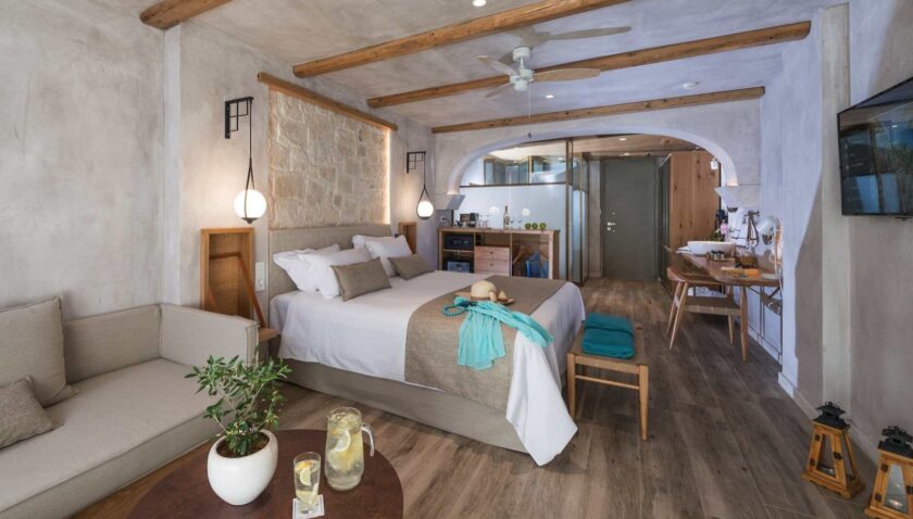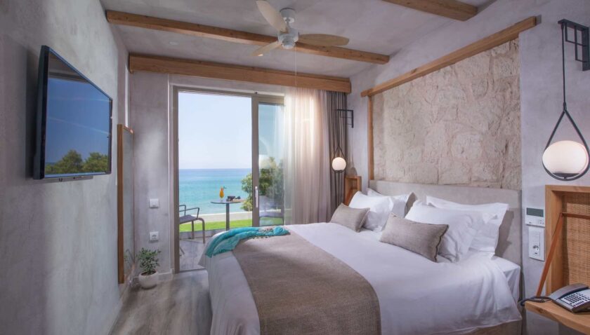 Doppel Superior: Das angenehm kühle Design der Anlage spiegelt sich auch in den Zimmern wieder. Die luftig leicht gestalteten Räume vereinen traditionelle Elemente mit modernem Design. Sie verfügen über Walk-In Dusche/WC, Föhn, Badannehmlichkeiten, Bademäntel, Slipper, Telefon, individuell regulierbare Klimaanlage, Safe, 40“ Flatscreen TV, Minibar (gegen Gebühr, alle 2 Tage Auffüllung mit 1 Flasche Wasser, 2 Softdrinks, 2 Fruchstäfte, 2 Bier, 1 kleine Flasche Wein sowie Ouzo, Vodka und Gin), Wi-Fi, Kaffee-/Teezubereiter (tägliche Auffüllung), Nespresso Maschine (2 Kapseln pro Tag inklusive), Kissenmenü sowie Balkon oder Terrasse (DSU).