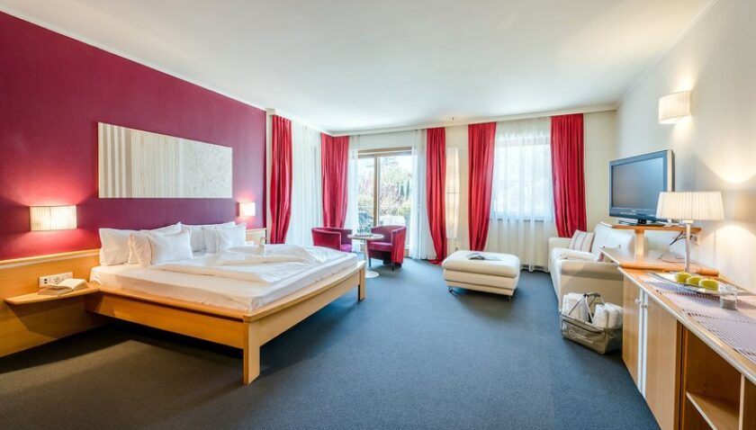 - Gartensuite (JSX2), Juniorsuite, Nichtraucherzimmer, Südseite, Gartenblick, ca. 45 m², Gesamtanzahl der Räume in diesem Zimmertyp: 1, Aufteilung wie folgt: kombiniertes Wohn-/Schlafzimmer, 1 Doppelbett, 1 Zustellbett, Babybett: gegen Gebühr, Anfrage notwendig, Klimaanlage: ohne Gebühr, Januar – Dezember, individuell regelbar, kalt, warm, Safe: ohne Gebühr, Minibar: gegen Gebühr, Softdrinks: gegen Gebühr, Wasser: gegen Gebühr, alkoholische Getränke: gegen Gebühr, Telefon, Internet: WLAN/WiFi: ohne Gebühr, Fernseher: Flatscreen, deutsches Programm, Sat-TV, Radio, Roomservice: täglich, gegen Gebühr, Reinigungsservice: täglich, ohne Gebühr, Dusche, separates WC, Bademantel: ohne Gebühr, Slipper: ohne Gebühr, Föhn, Balkon oder Terrasse: mit Sitzgelegenheit