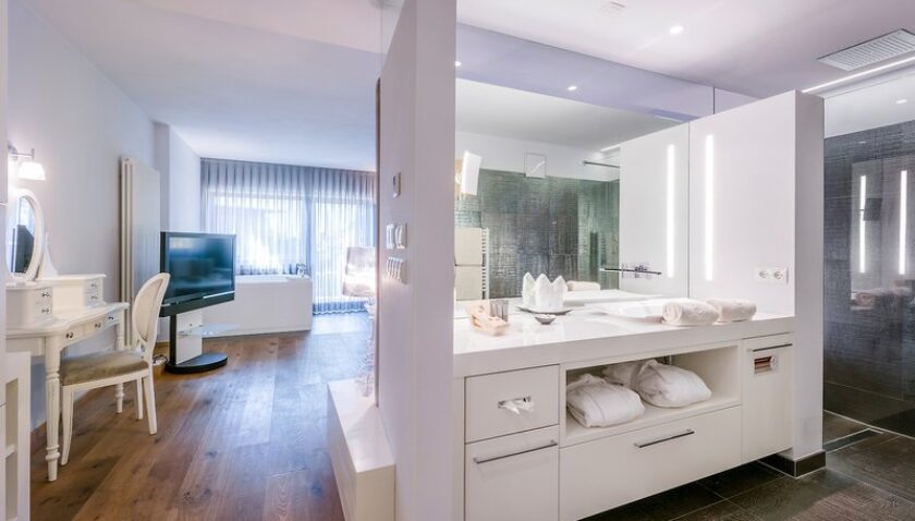 - SPA-Suite (SUX3), Juniorsuite, Nichtraucherzimmer, ca. 40 m², Gesamtanzahl der Räume in diesem Zimmertyp: 1, Aufteilung wie folgt: kombiniertes Wohn-/Schlafzimmer, 1 Doppelbett, 1 Zustellbett, Babybett: gegen Gebühr, Anfrage notwendig, Klimaanlage: ohne Gebühr, Januar – Dezember, individuell regelbar, kalt, warm, Safe: ohne Gebühr, Minibar: gegen Gebühr, Softdrinks: gegen Gebühr, Wasser: gegen Gebühr, alkoholische Getränke: gegen Gebühr, Telefon, Internet: WLAN/WiFi: ohne Gebühr, Fernseher: Flatscreen, deutsches Programm, Sat-TV, Radio, Roomservice: täglich, gegen Gebühr, Reinigungsservice: täglich, ohne Gebühr, Dusche, Whirlpool, WC, Bademantel: ohne Gebühr, Slipper: ohne Gebühr, Föhn, Balkon: mit Sitzgelegenheit