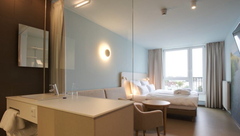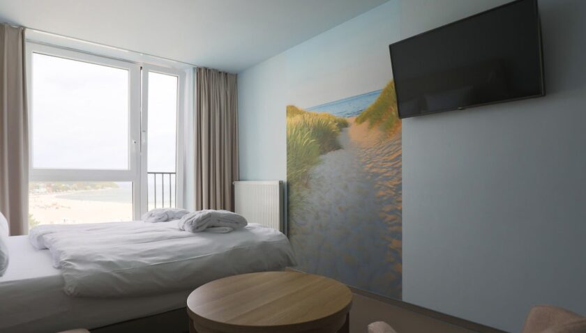 - Traveblick, Typ 1 (DZX1), Doppelzimmer, Nichtraucherzimmer, im Hauptgebäude, erste Strandreihe, ca. 22 m², Gesamtanzahl der Räume in diesem Zimmertyp: 1, Aufteilung wie folgt: kombiniertes Wohn-/Schlafzimmer, 1 King Size Bett (1,8x2cm), Babybett: ohne Gebühr, Anfrage & Reservierung notwendig, Heizung: individuell regelbar, Fußboden: PVC, Sofa, Internet: WLAN/WiFi, Fernseher: Flatscreen, im Wohnbereich, Sat-TV, Radio, Dusche, separate Dusche, separates WC, Bademantel: ohne Gebühr, Bad durch Glaswand getrennt, Föhn