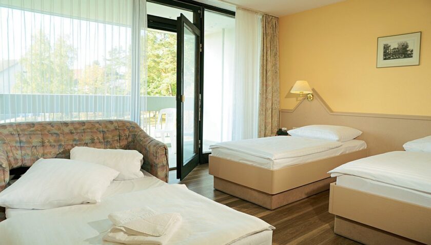 mit Bad, WC, Sat.-TV, Föhn, Kühlschrank, Balkon/Terrasse Doppel-/Einzelzimmer (2A/1A): Haus 2, Nichtraucherzimmer, ca. 35 qm, mit 2 Einzelbetten, Schlafsofa ca. 1,20 x 2 m, (EZ=DZ) Doppel-/Einzelzimmer (2B/1B): Haupthaus, ca. 35 qm, 2 Einzelbetten, Schlafsofa ca. 1,20 x 2 m, (EZ=DZ) Familienzimmer (2-Raum) (2G): für 2 Erw. und mind. 1 bis max. 4 Kinder bis 15 J., Haus 3, 2 miteinander verbundene Nichtraucherzimmer, ca. 70 qm, jeweils mit Bad/WC, 2 Einzelbetten, Schlafsofa 1 Babybett: bis 2 Jahre inklusive. Die max. Personenzahl darf durch Kinder unter 2 Jahre nicht überschritten werden