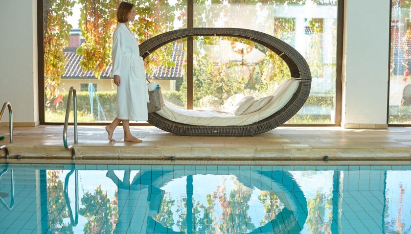 Wellnessbereich im klimaneutralen Biohotel Eggensberger: großzügig mit Hallenbad (10 x 5 m), Saunalandschaft mit finnischer Sauna, Bio-Sauna, Infrarotkabine, Dampfbad, Frigidarium, Kneippbecken, Außensauna (nicht täglich), Ruhe- und Freiluftbereich inklusive. Gegen Gebühr: medizinische und Wellnessmassagen, Fußreflexzonenmassage, Physiotherapie mit Haltungs- und Ganganalyse, Körper- und Kosmetikbehandlungen, medizinische Bäder (Kräuter- und Naturprodukte).