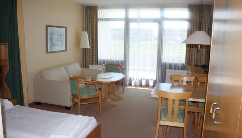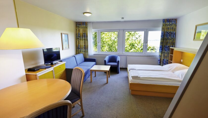- Fernblick Typ A1 (APX5), Ferienwohnung, Seeseite, ca. 31 – 40 m², kombiniertes Wohn-/Schlafzimmer, 1 Doppelbett, Babybett: ohne Gebühr, Sitzecke, Kochnische, Kaffeemaschine, Wasserkocher, Toaster, Telefon, Fernseher: Sat-TV, WC, Föhn, Balkon: mit Sitzgelegenheit, Nebenkosten: Endreinigung: ohne Gebühr