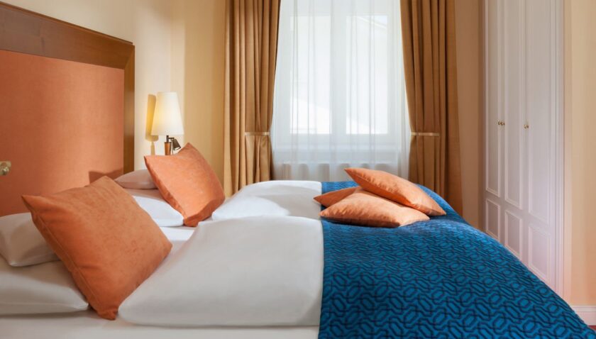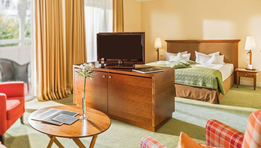 - Suite Deluxe (SUX2), Suite, Nichtraucherzimmer, im Hauptgebäude, Landseite, Stadtblick, ca. 55 – 60 m², bestehend aus 2 Doppelzimmern mit Verbindungstür, 1 Doppelbett, 1 Schlafsofa, Babybett, Heizung: individuell regelbar, Fußboden: Teppichboden, Safe, Sitzecke, Sofa, Minibar, Telefon, Internet: WLAN/WiFi: ohne Gebühr, Fernseher: im Wohnbereich, im Schlafzimmer, Radio, Roomservice: gegen Gebühr, Reinigungsservice: gegen Gebühr, Tageszeitung, Dusche, WC, Bademantel, Slipper, Föhn, Kosmetikspiegel