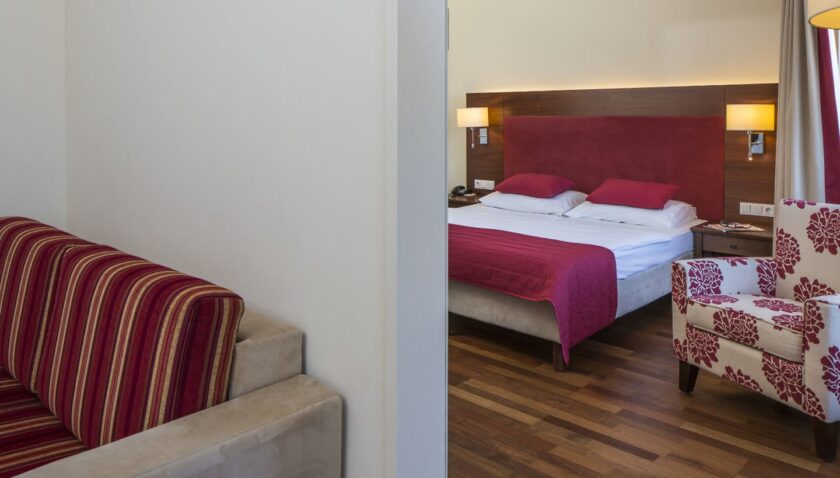 - Junior Suite (JSX1), Juniorsuite, Nichtraucherzimmer, im Hauptgebäude, Bergblick, Gartenblick, ca. 43 m², Gesamtanzahl der Räume in diesem Zimmertyp: 2, Aufteilung wie folgt: Wohnzimmer, 1 Schlafzimmer, 2 Einzelbetten (90x200cm), 1 Schlafsofa (160x195cm), Heizung, Safe: ohne Gebühr, Schreibtisch, Nespressomaschine, Kaffee-/Teezubereiter, Minibar: gegen Gebühr, Internet: WLAN/WiFi: ohne Gebühr, Fernseher: Kabel-TV, Roomservice: gegen Gebühr, Dusche, Badewanne, separates WC, Bademantel: ohne Gebühr, Slipper: ohne Gebühr, Föhn, Kosmetikspiegel, Terrasse: Dachterrasse