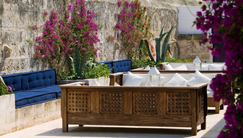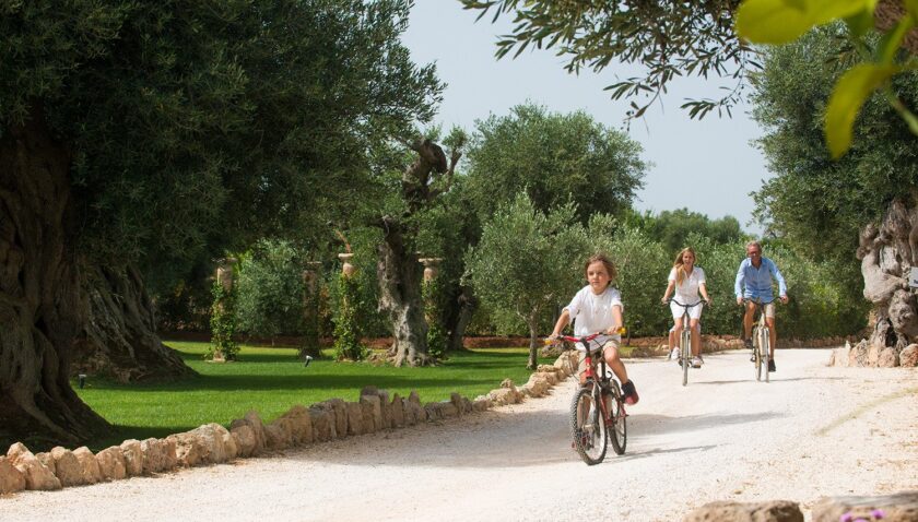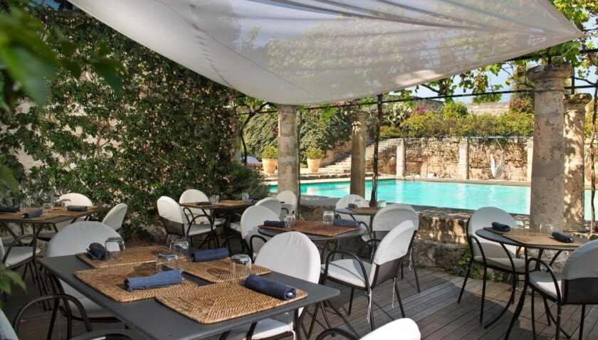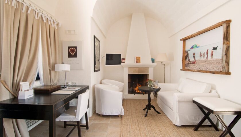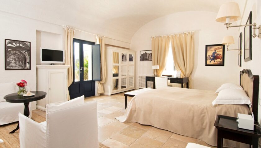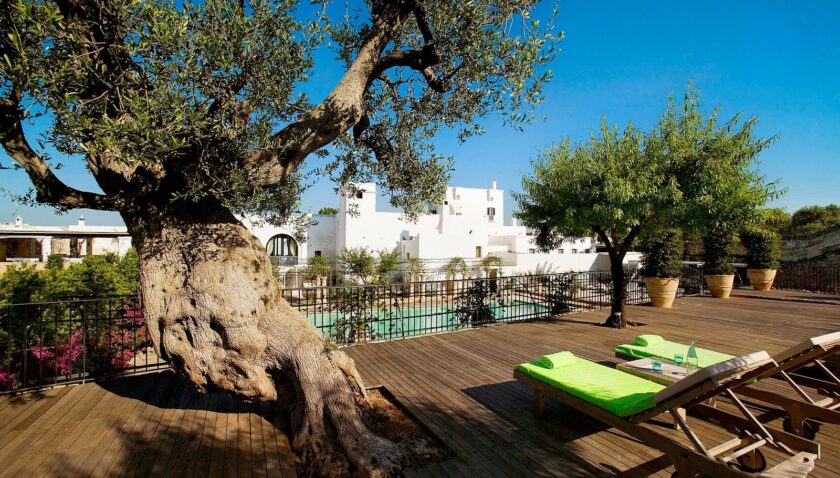 Inmitten jahrhundertealter Olivenfelder zeigt sich der Kontrast des Hauses in einer Verbindung aus modern-eleganten Zimmern und historischen Gebäuden. Im ausgezeichneten Restaurant „Le Palme“ genießen Gäste Interpretationen apulischer Küche.