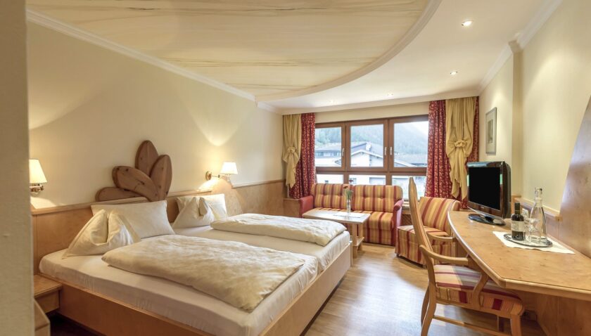 - Juniorsuite de Luxe (JSX1), Juniorsuite, Nichtraucherzimmer, Bergblick, ca. 35 – 40 m², kombiniertes Wohn-/Schlafzimmer, 1 Doppelbett (180x200cm), Babybett: ohne Gebühr, Anfrage notwendig, Safe: ohne Gebühr, Sitzecke, Sofa, Minibar: gegen Gebühr, Telefon, Internet: WLAN/WiFi: ohne Gebühr, Fernseher: Sat-TV, Radio, Reinigungsservice: täglich, ohne Gebühr, Badewanne oder Dusche, WC, Bademantel: ohne Gebühr, Slipper: ohne Gebühr, Föhn, Kosmetikspiegel, Balkon: mit Sitzgelegenheit