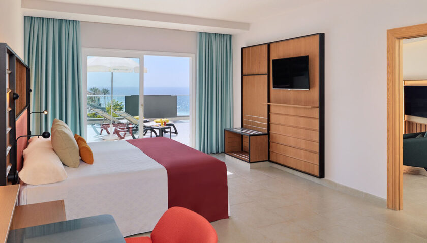 - Juniorsuite Meerblick Typ1 (JSM1), Juniorsuite, Nichtraucherzimmer, Meerblick, ca. 40 – 60 m², Gesamtanzahl der Räume in diesem Zimmertyp: 1, Aufteilung wie folgt: kombiniertes Wohn-/Schlafzimmer, Babybett: ohne Gebühr, Anfrage notwendig, Klimaanlage: individuell regelbar, Fußboden: Fliesenboden, Safe: ohne Gebühr, Schreibtisch, Minibar: gegen Gebühr, bei All Inclusive inklusive, Softdrinks: gegen Gebühr, bei All Inclusive inklusive, Wasser: gegen Gebühr, bei All Inclusive inklusive, alkoholische Getränke: gegen Gebühr, bei All Inclusive inklusive, Snacks: gegen Gebühr, Minibarauffüllung: täglich, Telefon, Internet: WLAN/WiFi: ohne Gebühr, Fernseher: Flatscreen, deutsches Programm, Sat-TV, Roomservice: täglich, gegen Gebühr, Reinigungsservice: täglich, ohne Gebühr, separate Dusche, Badewanne, WC, Bademantel, Föhn, Kosmetikspiegel, Balkon oder Terrasse: mit Liegen, mit Sitzgelegenheit