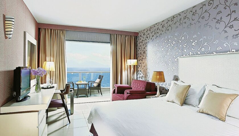 - Doppelzimmer Meerblick Superior (DZM2), Doppelzimmer, Nichtraucherzimmer, im Nebengebäude, Meerblick, ca. 25 m², Gesamtanzahl der Räume in diesem Zimmertyp: 1, Aufteilung wie folgt: 1 Schlafzimmer, 1 Queen Size Bett (180x195cm), 1 Schlafsofa (90x190cm), Babybett: ohne Gebühr, Anfrage nicht notwendig, Reservierung notwendig, Klimaanlage: ohne Gebühr, individuell regelbar, kalt, warm, Fußboden: Fliesenboden, Safe: ohne Gebühr, Schreibtisch, Kühlschrank: ohne Gebühr, Kaffee-/Teezubereiter, Wasserkocher, Minibar: gegen Gebühr, Softdrinks: gegen Gebühr, Wasser: gegen Gebühr, alkoholische Getränke: gegen Gebühr, Snacks: gegen Gebühr, Minibarauffüllung, Telefon, Internet: WLAN/WiFi: ohne Gebühr, Fernseher: Flatscreen, im Schlafzimmer, deutsches Programm, Sat-TV, Roomservice: täglich, gegen Gebühr, Reinigungsservice: täglich, ohne Gebühr, Badewanne, WC, Bademantel: ohne Gebühr, Slipper: ohne Gebühr, Föhn, kosmetikspiegel, Balkon: mit Sitzgelegenheit