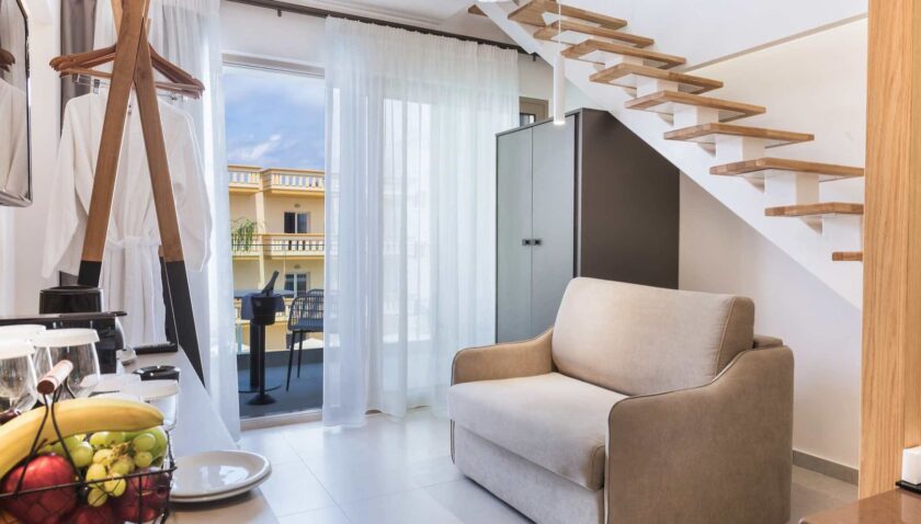 Maisonette: Bei gleicher hochwertiger Ausstattung wie die Doppelzimmer Deluxe befindet sich das Schlafzimmer im Erdgeschoss und der Wohn-/Schlafraum, Bad/WC und Balkon in der oberen Etage (M2). Wahlweise auch mit seitlichem Meerblick (2SM) buchbar.