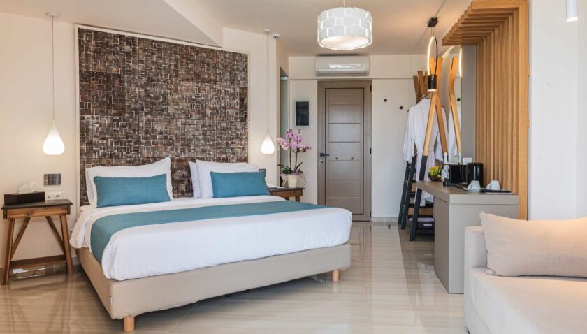 Juniorsuite Beach Front: Die Juniorsuiten bieten bei gleicher hochwertiger Ausstattung und Service wie die Doppelzimmer Deluxe einen Wohnbereich und einen Balkon mit traumhaftem Meerblick (ca. 30 m², JB2).Buchbare Verpflegungsmöglichkeiten: Halbpension/Vollpension: Reichhaltiges Frühstücksbuffet (7:30-10:30 Uhr) und Abendessen (19-21:15 Uhr) mit internationalen und landestypischen Speisen an abwechslungsreichen Buffets sowie Show-Cooking. Themenabende. Bei Buchung mit Vollpension zusätzlich Mittagessen. Ein Mal pro Woche können die Gäste die traditionelle kretische Atmosphäre und Küche in der Taverne Zorbas genießen (Zorbas Apartments in ca. 5-10 Min bequem fußläufig erreichbar, inklusive vorgegebenes Menü).Landeskategorie: 5 Sterne